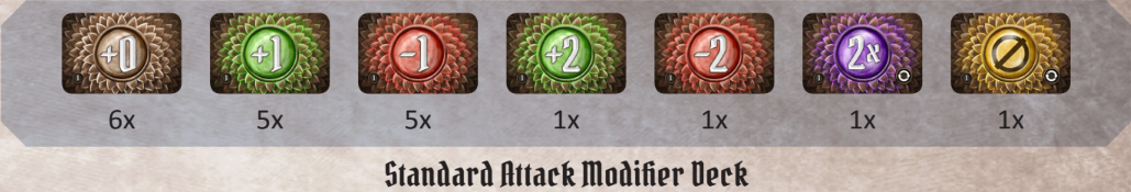 Any time an Attack ability is performed, a separate attack modifier card is drawn for each individual target of the attack. Players draw from the personal attack modifier deck for their chosen character and monsters draw from a collective monster deck. The modifier listed on the card is then applied to the attack, possibly reducing or increasing its numerical value. |