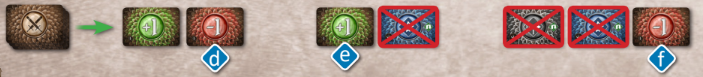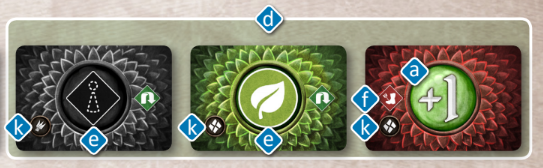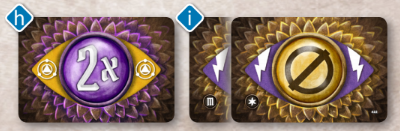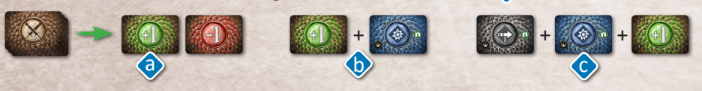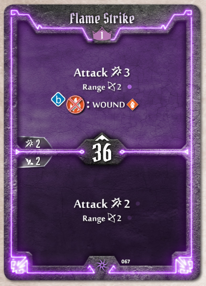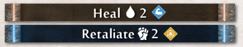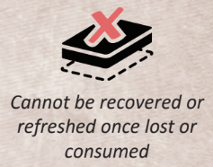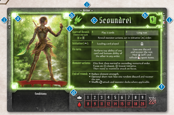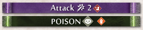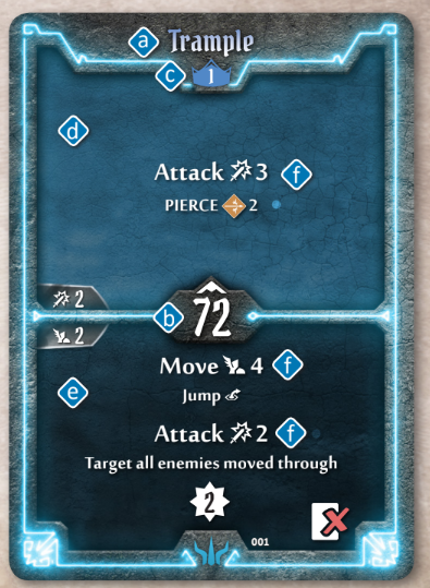 During a player’s turn, the two played cards will be used to perform actions and then are either discarded, lost, or activated, depending on the actions that were taken. Played cards are normally placed in a player’s discard pile unless otherwise noted. Discarded cards can be returned to a player’s hand through resting (see below). If the performed action from a card contains a Players must either play two cards from their hand or declare a long rest action at the beginning of every round. If a player only has one card or no cards in their hand, the long rest action is their only option. If this option is also not available at the beginning of a round because a player has only one card or no cards in their discard pile as well, that player is considered exhausted and can no longer participate in the scenario (see Exhaustion on p. 28 for details). |