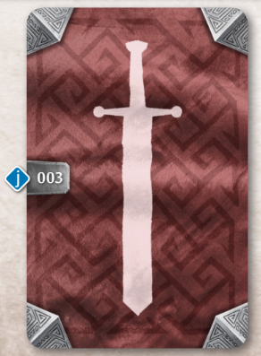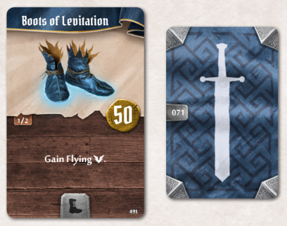 Whenever a “Random Item Design” is listed as the reward when looting a treasure tile, the looting player should draw a card from the random item design deck. These cards look very similar to normal item cards, but have a blue back, shown at the right. When a card is drawn, the player should find the one additional copy of the drawn item with the same reference number in the deck of unavailable items and add both cards to the city’s available supply of items. It is possible to deplete the random item design deck. In this case, additional random item design rewards have no effect. |