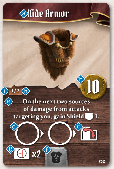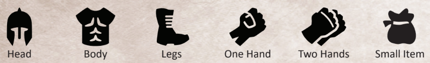 Item cards are acquired by spending gold in between scenarios or looting specific treasure tiles. All item cards a character equips will be placed below his or her character mat and can be used during a battle to augment his or her abilities. Item cards are not class-specific, so any character can use any item. However, characters are limited in the number of items they can equip (bring into a scenario). Each character can equip only one