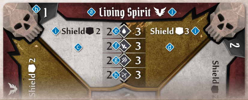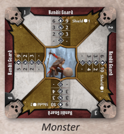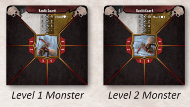 Monster statistic cards give easy access to the base statistics of a given monster type for both its normal and elite variants. A monster’s base statistics will vary depending on the scenario level (see Scenario Level on p. 15 for details). Each edge of the cards, on both sides, reflects the statistics for a given scenario level. Rotate or flip the card to show the required level.