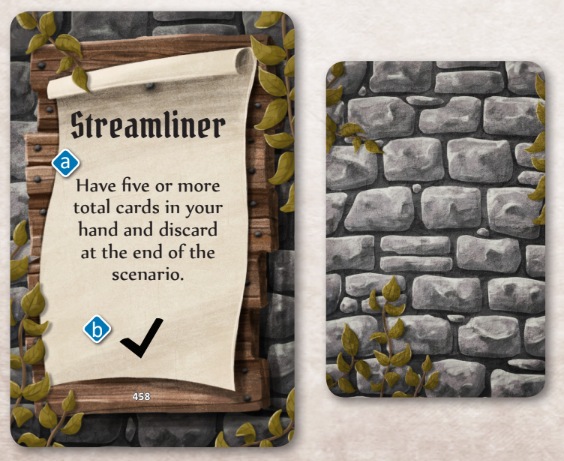 The total number of enhanced cards in a class’s ability deck must be equal to or less than the prosperity level of the town. Once placed, enhancement stickers should never be removed. Enhancements persist through all instances of a specific character class, even after retirement.