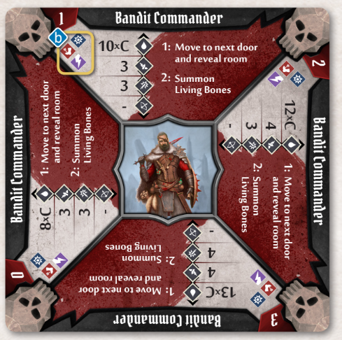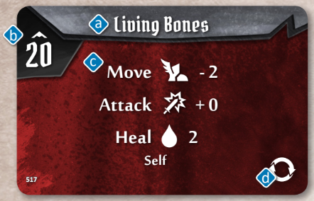 Example: At the start of the round, the Brute decides that he wishes to play the two cards shown. He also decides he wants to go late in the round, so he choses the “61” as his leading card. If he had wanted to go early, he could have chosen the “15” as the leading card. The Scoundrel reveals a leading card with “86” initiative, and the played Living Bones and Bandit Archer monster ability cards have “45” and “32” initiative respectively. The Bandit Archers activate first, then all of the Living Bones, then the Brute, and finally the Scoundrel. |