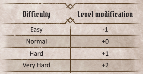 A scenario’s level can be set to any number from 0 to 7, but cannot be changed once the scenario begins. The recommended scenario level is equal to the average level of the characters in the party, divided by 2 and rounded up; this would be considered “Normal” difficulty. If players desire an “Easy” experience, they can reduce the recommended scenario level by 1. If a more difficult experience is desired, the scenario level can be raised by 1 for “Hard” or 2 for “Very Hard.” |