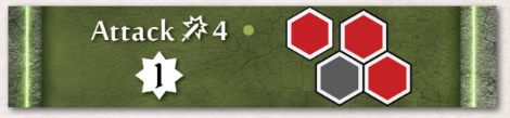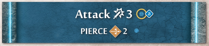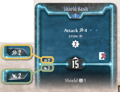 Example: The Scoundrel performs an “Attack 3” ability on an adjacent elite Bandit Guard. The Scoundrel adds a +2 attack modifier because of specific conditions set by the card and also is allowed to double the attack because of an active card in front of her. She chooses to add the +2, then doubles the result, resulting in an “Attack 10.” She then plays an attack modifier card to reveal a “-1,” so the attack is reduced to 9. Finally, the Bandit Guard has a shield value of 1, so the attack value is reduced to 8 and the bandit suffers 8 damage.