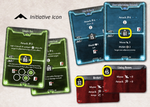 Initiative order is determined by comparing the initiative values on all played monster ability cards and all of the players’ leading cards. Whoever has the lowest initiative value takes their turn first, then the next highest, and so on until every figure on the board has acted. When a monster type takes an action, each monster of that type will perform the actions listed on their played ability card, starting with elites and then normal monsters in ascending standee order.
