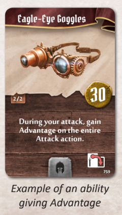 Instances of Advantage and Disadvantage are mostly gained by specific character or monster abilities. However, any ranged attack targeting an adjacent enemy also gains Disadvantage for that target. Instances of Advantage or Disadvantage don’t stack, and if an attack has instances of both Advantage and Disadvantage, they cancel out each other and the attack is performed normally.