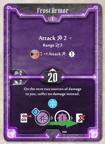 Playing ability cards is what allows a character to perform actions in a scenario. Each round players choose two ability cards and use the top action of one card and the bottom action of the other card, resulting in two actions for each player on his or her turn. All ability cards are specific to a character class and are acquired when starting a new character or by leveling up.