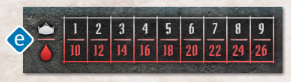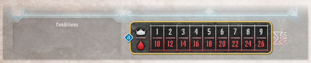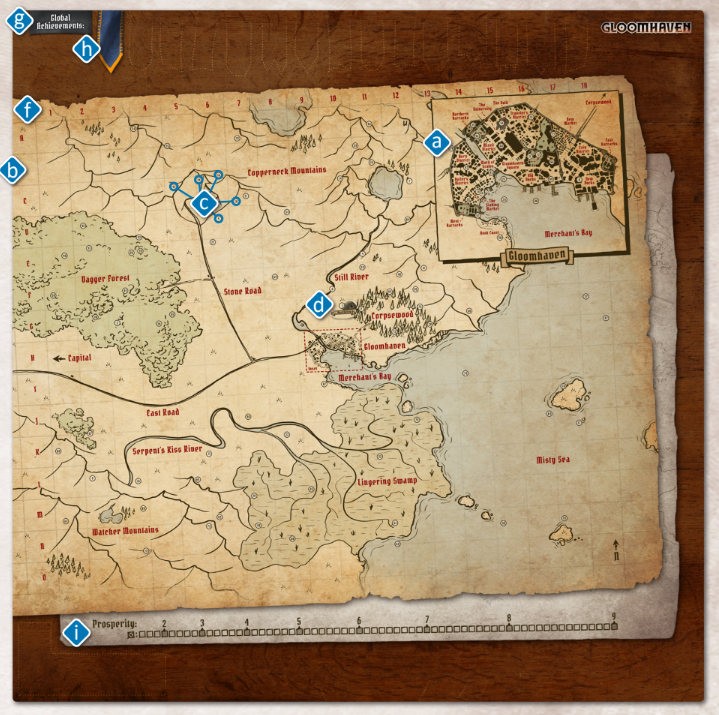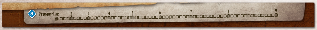 As the characters grow in power, the town of Gloomhaven grows in prosperity. Gloomhaven prosperity can be gained either through certain events or by completing certain scenarios. The prosperity points are tracked along the bottom of the map board