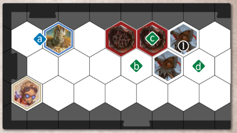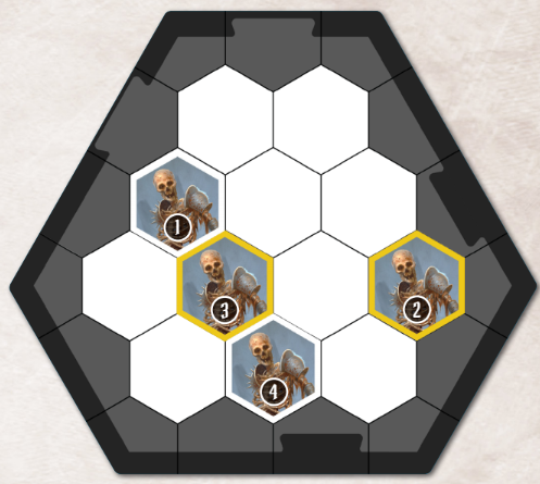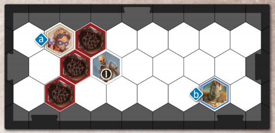 A “Move X” ability allows a character to move up to X number of hexes on the map. Figures (characters and monsters) can move through allies, but cannot move through enemies or obstacles. Traps and other terrain effects of hexes must be resolved when a figure enters them with normal movement. A figure cannot end its movement in the same hex as another figure. Figures can never move through walls. |