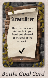 At the beginning of every scenario, each character receives two battle goal cards in secret and chooses one to keep, discarding the other. If the scenario is successfully completed and the character meets the criteria of the chosen card |