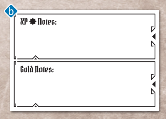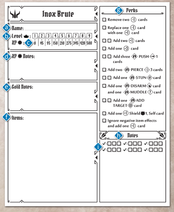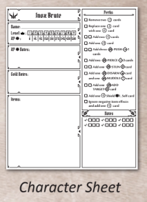 When a new character is created, the player should start a new entry in the character’s corresponding character sheet notepad. As players play through a campaign, they will need to keep notes on what experience, gold, items, perks, and available ability cards they have in their deck by using this character sheet.