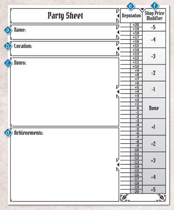Reputation is tied to a specific party and is tracked on the party sheet. Any time a new party is formed, that party starts at 0 reputation. Through event consequences or by completing certain scenarios, the party will gain or lose reputation. A party can have a maximum reputation of 20 and a minimum reputation of -20.