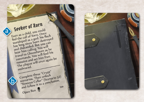 Fulfilling personal quests will always unlock new content for the game. They will allow the player to open a sealed box or envelope, which will usually unlock a new character class. Any time players are directed to open a box or envelope and it has already been opened because of some previous condition, a new random item design and random side scenario are unlocked instead (see p. 38 for details). When a personal quest is fulfilled, the personal quest card is removed from the game.