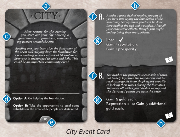Once per visit to Gloomhaven, a party may complete a city event. City events are functionally the same as road events, but are drawn from the city event deck and generally have better outcomes than road events.