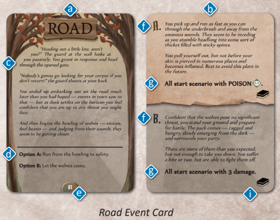 Players will have many opportunities to encounter city and road events throughout a campaign. When players encounter an event, they draw the top card off the corresponding deck and read the front side
