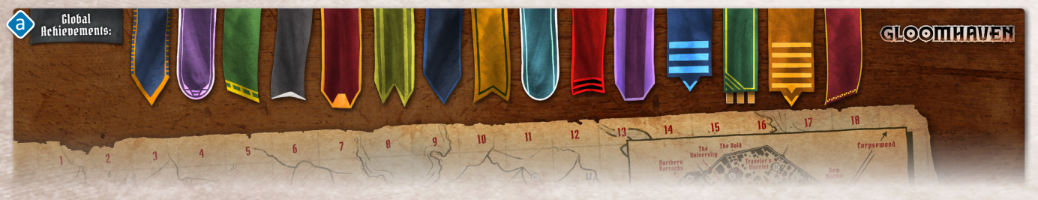 Global achievements affect the entire game world, regardless of what party is playing in it. Global achievements are tracked with stickers along the top of the world map