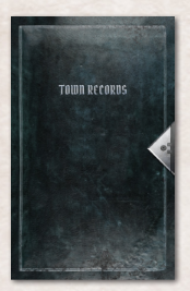 The game box also includes a small sealed book titled “Town Records.” Players are directed to open this book once the first character retires, at which point they can begin reading the book from front to back. At certain points in the book, players will be directed to stop reading until certain conditions are met. |