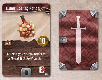 Players can also use any card they play as an “Attack 2” action on the top half or a “Move 2” action on the bottom. If a card is used this way, it is always discarded, regardless of what is printed on the card. On their turn, before, during, or after performing their two actions, players can use any number of items they have equipped. |