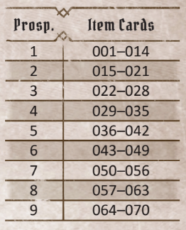 When the game box is opened and the campaign begins, the city’s available supply should consist of all copies of Item 001 through Item 014. Over the course of the campaign, many more items will be added to the city’s available supply based on the following conditions: