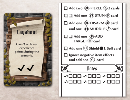 Any time a character successfully completes a battle goal card at the end of a scenario, they receive a number of checkmarks, which are tracked in the specified area of the notes section of their character sheet. For every three checkmarks a character earns, he or she immediately gains an additional perk on their character sheet and applies its effects to their attack modifier deck. Any checkmarks from a battle goal that are left over after achieving a perk are applied toward the next perk. A character can achieve a total of six additional perks in this way. |