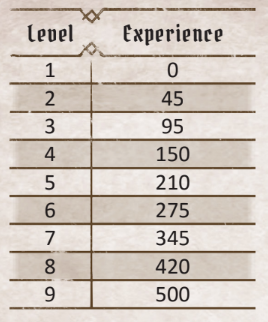When a character gains the amount of experience listed on the table to the right, they must level up. Leveling up only occurs in town. When a character reaches a new level, add one new card to their active card pool. The card selected must be from the character’s class and have a card level equal to or less than the character’s new level. Additionally, when leveling up, the player can mark one of the perk boxes on the right side of their character sheet. This signifies an evolution of the character’s attack modifier deck. Apply the bonuses of the marked perk box to the character’s modifier deck using the class’s accompanying deck of available modifier cards. If a perk has multiple check boxes next to it, this means that the perk can be gained multiple times for the cost of one perk each. |