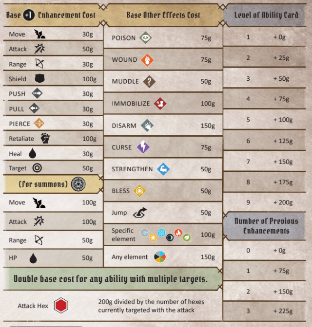 Ability cards can be enhanced in a variety of ways, with each costing a specific amount of gold. This cost must be paid by the character whose ability card is being enhanced.
