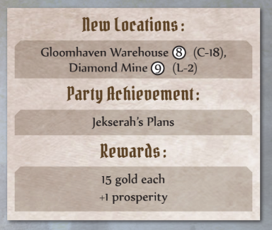When a scenario is successfully completed as part of the campaign, a number of rewards are gained by the party. These are listed at the end of the scenario’s entry in the Scenario Book. Rewards can include global or party achievements, extra gold or experience for each party member, prosperity increases, unlocked scenarios, items, or item designs. As discussed on p. 42, if a scenario reward directs a party to lose something, they can’t lose more than what they have. |