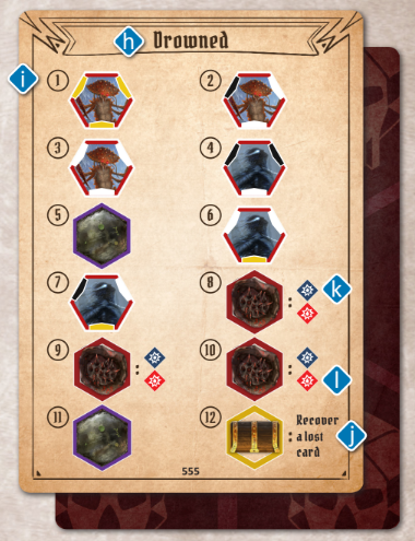 . Note that the scenario numbers in circles within the story text do not unlock scenarios. These are simply references to what the story text is referring to. If an item is gained as a reward, players should find one copy of that item from the deck of unavailable items and give it to one of the present characters. If an item design is gained as a reward, players should find all copies of that item from the deck of unavailable items and add them to the city’s available supply of items.